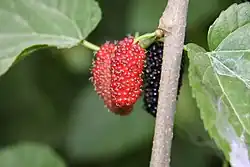 - leurs fruits : mûrier noir, mûrier blanc et hybrides tels que 'Illinois Everbearing' (mûrier blanc × mûrier rouge, le mûrier noir ne s'hybride pas car il compte 308 chromosomes contre généralement 28 pour le blanc et le rouge). Ce sont des fruits de bouche, consommés frais et séchés notamment les mûres blanches qu'on sèche en Iran, au Pakistan et en Asie Centrale et qui sont alors sucrées et aromatiques.