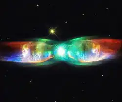 Elle est issue du cycle de fin de vie de son étoile centrale (évolution stellaire) passée par une phase de géante rouge, puis de naine blanche, qui a expulsé la plupart de ses couches de gaz externes sous forme de jets bipolaires symétriques en formes de deux bulles de vent stellaire en expansion, d'environ 1,6 années-lumière d'envergure.
