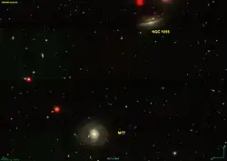 Sa vitesse par rapport au fond diffus cosmologique est de 914 ± 16 km/s, ce qui correspond à une distance de Hubble de 13,5 ± 1,0 Mpc (44 millions d'al)[1]. M77 a été découvert par l'astronome français Pierre Méchain en [3].