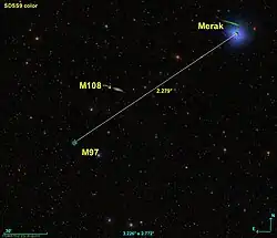 M97 est située à environ 2,3 degrés au sud-est de l'étoile Beta Ursae Majoris (Merak). La galaxie M108 est près de M97, à environ 50' au nord-ouest[10].