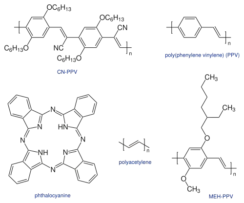 Le MEH-PPV — in extenso poly[2-méthoxy-5-(2-éthyl-hexyloxy)-1,4-phénylène-vinylène] — est un polymère semiconducteur de type p (donneur d'électrons) étudié pour former des jonctions p-n, notamment avec le PCBM comme matériau de type n (accepteur d'électrons), permettant de réaliser des cellules photovoltaïques en polymères ayant un bon rendement énergétique[2],[3].
