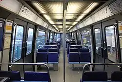 Pour la première fois dans le métro parisien, les voitures n'ont plus que trois grandes portes par face, au lieu des quatre plus petites habituelles, ceci dans le but de lutter contre l'« effet entonnoir » des voyageurs devant les portes sur le quai. Cela diminue également le nombre de places assises, mais permet une place bien plus importante pour les jambes[2].