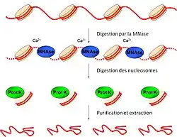 Cette technique repose sur le séquençage à haut débit de fragments issus de la digestion par MNase. La digestion de la chromatine par MNase est elle-même une méthode relativement simple et efficace qui permet d’identifier les régions d’ADN occupées par un ou plusieurs nucléosomes[1],[2]. Lorsque des noyaux de cellules perméabilisées sont exposés à la MNase, en présence d’un cation divalent (par exemple le Ca2+), cette nucléase effectue des coupures double-brin entre les nucléosomes, comme montré sur la figure ci-contre. Le traitement de substrats chromatiniens avec de très hautes concentrations en MNase produit une majorité de mononucléosomes. Une migration sur gel, suivie d’une coupure autour de 146 paires de base (p.b.) permet de s’assurer de l’obtention d’une grande majorité de mononucléosomes. Les fragments issus de ce processus sont ensuite séquencés selon les divers protocoles de séquençage à haut débit.