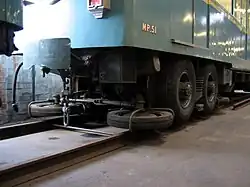 La RATP décide alors de commander et tester un prototype, le MP 51, qui devient le premier métro sur pneumatiques au monde[4]. Celui-ci est guidé par des roues horizontales prenant appui sur deux barres latérales de guidage, une des barres servant également à l'alimentation électrique. Un essieu métallique classique de chemin de fer assure le guidage au passage des aiguillages ou en cas de crevaison, seuls cas pour lesquels ils sont en contact avec la voie ferrée ordinaire. Les roues en acier tournent en situation normale à quelques centimètres au-dessus des rails. Les quatre roues par bogie équipées de pneumatiques sont placées de part et d'autre des essieux en acier, et circulent sur des pistes de roulement en bois (azobé) ou en fer, placées de chaque côté des rails[2].