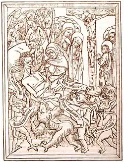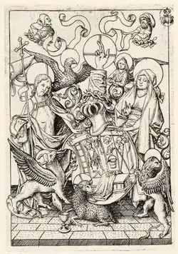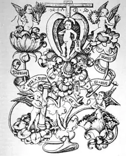 Connues dès le XIIIe siècle pour répondre à des pratiques dévotionnelles qui s'individualisent, les images pieuses sur feuillet isolé se développent et se popularisent à la fin du XIVe siècle grâce à l'apparition de procédés mécaniques de reproduction de masse, la gravure sur bois tout d'abord, puis sur cuivre[52]. Privilégiant les épisodes particulièrement chargés de pathos des récits bibliques ou hagiographiques, elles visaient à susciter l'émotion du spectateur pour encourager, par un dialogue entre l'image et son observateur, l'édification de ce dernier. Un des thèmes favoris de ces images de dévotion est la représentation du Christ en Homme de douleurs, allégorie traditionnelle de la Passion.