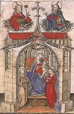 Les trois gravures de la Madone d'Einsiedeln, toutes datées de 1466, sont caractéristiques de telles images pieuses. Il s'agit de trois représentations de la Vierge en majesté, de formats différents : la Grande Madone d'Einsiedeln (L. 81, 206 × 123 mm), la Petite Madone d'Einsiedeln (L. 72, 133 × 87 mm), et la Très petite Madone d'Einsiedeln (L. 68, 97 × 65 mm)[42]. Elles tirent leur nom de l'inscription en lettres gothiques qui figure sur la voûte en plein cintre représentée dans la Grande Madone : « Dis ist die engelwichi zu unser liben frouwen zu den einsidlen ave gr(a)cia plenna » (« Ceci est la consécration angélique à notre Madone bien-aimée d'Einsiedeln je vous salue [Marie] pleine de grâce »)[43].