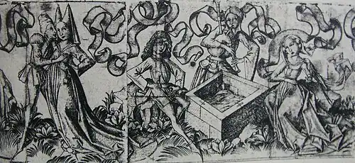 L'un des premiers maîtres de la gravure sur cuivre à présenter une œuvre stylistiquement cohérente est le Maître des Cartes à jouer, actif entre 1435 et 1455, et ainsi nommé en raison de neuf jeux de cartes qu'il a produits, dont il reste une soixantaine de gravures à exemplaire unique[15], réparties entre le Cabinet des estampes de Dresde et la Bibliothèque nationale de France[23]. Maître E. S., à qui sont également attribués deux jeux de cartes, fait partie de la seconde génération des graveurs au burin allemands.