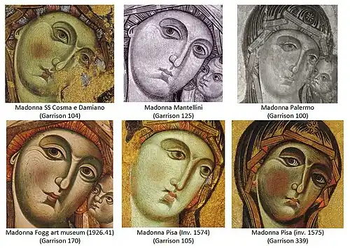 Carli en 1958[10] même s'il écartait la relation entre la Madone de Santi Cosma e Damiano et la Madone Mantellini, mettait en avant la forte similitude entre celle-ci, celle du Fogg art museum et une troisième, la Madone no 8 (aujourd'hui inv. 1575) du museo civico de Pise[11], que Garrison, sous le numéro 339, avait clairement dissociée des 5 autres.