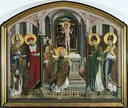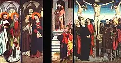 - Appelée retable de Sayn (« Saynscher Altar »), d'après le comte de Sayn, vers 1460, huile sur panneau de chêne, 116 × 113 cm. Salle du trésor de la cathédrale d' Aix-la-Chapelle. À gauche de la croix, Marie et Jean et d'autres saints, à droite divers personnages. Au pieds, un grand blason empanaché. Au dos, une Vierge à l’Enfant adorée par un comte Sayn.