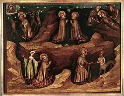 - Martyre des Dix Mille. 52,2 × 67 cm, toile. Cologne, Wallraf-Richartz-Museum, WRM 52. Les deux tableaux faisaient partie d'un panneau plus grand : le Martyre en constituait la partie supérieure gauche, les Scènes de saint Antoine la partie supérieure droite[7] d'où il résulte une largeur totale, bordure comprise, d'au moins 136,4 cm.