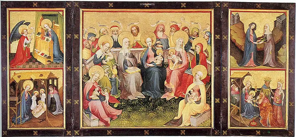 - un triptyque dont le panneau central représente une Conversation sacrée, et les volets des scènes de la vie du Christ, sur leurs faces extérieures et intérieures (vers 1400, collection Heinz Kisters, Kreuzlingen)