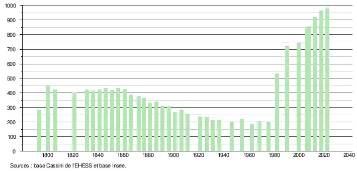 L'évolution du nombre d'habitants est connue à travers les recensements de la population effectués dans la commune depuis 1793. Pour les communes de moins de 10 000 habitants, une enquête de recensement portant sur toute la population est réalisée tous les cinq ans, les populations de référence des années intermédiaires étant quant à elles estimées par interpolation ou extrapolation[16]. Pour la commune, le premier recensement exhaustif entrant dans le cadre du nouveau dispositif a été réalisé en 2007[17].