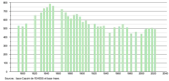 L'évolution du nombre d'habitants est connue à travers les recensements de la population effectués dans la commune depuis 1793. Pour les communes de moins de 10 000 habitants, une enquête de recensement portant sur toute la population est réalisée tous les cinq ans, les populations de référence des années intermédiaires étant quant à elles estimées par interpolation ou extrapolation[23]. Pour la commune, le premier recensement exhaustif entrant dans le cadre du nouveau dispositif a été réalisé en 2007[24].