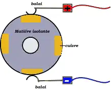 - d'un rotor bobiné relié à un collecteur rotatif inversant la polarité de chaque enroulement rotorique au moins une fois par tour de façon à faire circuler un flux magnétique transversal en quadrature avec le flux statorique. Les enroulements rotoriques sont aussi appelés enroulements d'induits, ou communément « induit » en référence au fonctionnement en génératrice de cette machine.