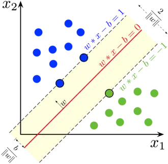 La première idée clé est la notion de marge maximale. La marge est la distance entre la frontière de séparation et les échantillons les plus proches. Ces derniers sont appelés vecteurs supports. Dans les SVM, la frontière de séparation est choisie comme celle qui maximise la marge[note 2],[10]. Le problème est de trouver cette frontière séparatrice optimale, à partir d'un ensemble d'apprentissage. Ceci est fait en formulant le problème comme un problème d'optimisation quadratique, pour lequel il existe des algorithmes connus.