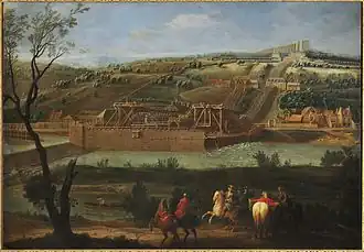 Assez loin en amont, Colbert fit canaliser une partie de la Seine en reliant les îles par des digues depuis l'île de Bezons et séparant ainsi le fleuve en deux bras, un bras occidental laissé à la navigation et un bras oriental destiné à alimenter la machine en créant un rétrécissement et une chute artificielle d'un[4] à deux mètres[5] pour entraîner les 14 roues à aubes de la machine.