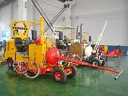 Une machine de traçage par pulvérisation peut aussi pulvériser des peintures à haute viscosité. L'efficacité de la construction est de 2 à 4 fois de la peinture au pistolet à air.