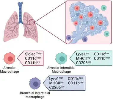 Les macrophages alvéolaires sont les macrophages résidant dans les tissus les plus abondants dans les voies respiratoires [7]. Peu de temps après la naissance, la population AM s'établit en réponse à la production de facteur stimulant les colonies de granulocytes et de macrophages par les cellules épithéliales alvéolaires (GM-CSF) [8]. Le GM-CSF régule positivement le facteur de transcription γ activé par les peroxisome proliferator-activated receptor gamma (PPARγ) dans les précurseurs embryonnaires, déclenchant la différenciation terminale en macrophage alvéolaire. L’établissement de la population de macrophages alvéolaires coïncide avec l’alvéologenèse. Les macrophages alvéolaires interagissent avec les cellules épithéliales alvéolaires pour contribuer à l'alvéologenèse [9]. Le maintien de la population dépend du GM-CSF provenant des cellules épithéliales alvéolaires et du facteur de croissance transformant β (TGF-β) qui est libéré par les macrophages alvéolaires [10]. Bien que les macrophages alvéolaires soient généralement considérés comme de nature anti-inflammatoire, ils sont très adaptables et leur phénotype dépend du microenvironnement environnant [9]. Jusqu'à récemment, les macrophages alvéolaires étaient considérés comme attaché à l'alvéole comme la plupart des autres macrophages résidant dans les tissus [11]. Cependant, l'imagerie in vivo a révélé que les populations de macrophages alvéolaires sont mobiles et se déplacent entre les alvéoles à travers les pores de Kohn [12]. La capacité des macrophages alvéolaires à se déplacer dans les voies respiratoires et entre les alvéoles en fait l’un des macrophages résidents tissulaires les plus uniques.