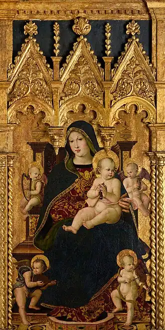 Cette Maestà est une Vierge au chardonneret entourée de quatre angelots musiciens. Le panneau de bois mesure 1,98 m de haut, il est peint à l'huile sur fond d'or dans le style gothique vénitien, utilisé comme retable derrière l'autel du couvent[2].
