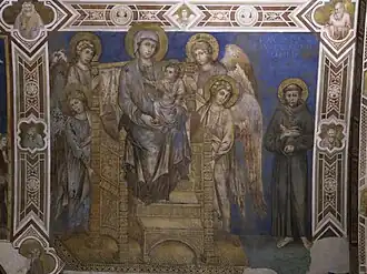 Situé dans le transept droit de l'église inférieure, cette fresque montre la Vierge à l'Enfant en majesté, c'est-à-dire sur un trône, entre quatre anges et avec une représentation de saint François debout à droite.