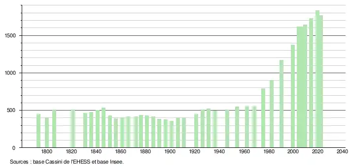 L'évolution du nombre d'habitants est connue à travers les recensements de la population effectués dans la commune depuis 1793. Pour les communes de moins de 10 000 habitants, une enquête de recensement portant sur toute la population est réalisée tous les cinq ans, les populations de référence des années intermédiaires étant quant à elles estimées par interpolation ou extrapolation[31]. Pour la commune, le premier recensement exhaustif entrant dans le cadre du nouveau dispositif a été réalisé en 2004[32].