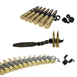 - Bande à maillons ouverts détachables : exemple bandes de calibre 7,62 mm OTAN pour mitrailleuses FN MAG, HK MG5, etc. ou de calibre 5,56 mm OTAN pour mitrailleuse FN MINIMI, HK MG4, etc.
