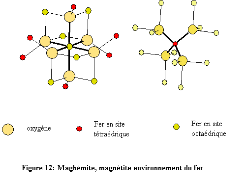 La magnétite est un oxyde mixte de fer(II) et de fer(III) de structure spinelle (aluminate de magnésium : Mg(II)Al(III)2O4) ; le cation divalent Mg(II) se trouvant en sites tétraédriques et le cation trivalent Al(III) en sites octaédriques. Dans le cas de la magnétite Fe(III)[Fe(III)Fe(II)O4], le spinelle est inverse car les sites tétraédriques sont occupés par un cation trivalent. Pour ce qui concerne la maghémite, le fer se trouve entièrement dans l’état trivalent d’oxydation,Fe(III), ce qui se traduit par l’apparition de lacunes cationiques, notées □.