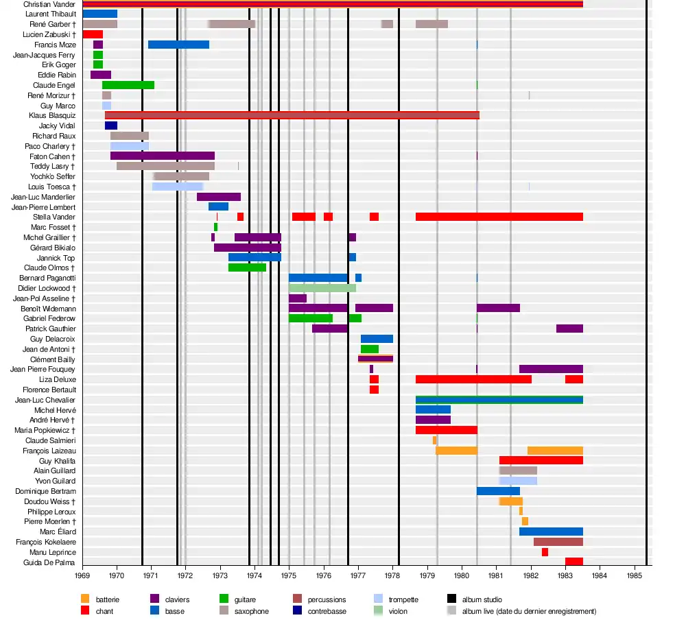 Laurent Thibault René Garber (†) Francis Moze Jacky Vidal Zabu (†) René Morizur (†) Alain Charlery (†) Klaus Blasquiz Richard Raux Claude Engel Teddy Lasry (†) François Cahen (†) Yochk’o Seffer Louis Toesca (†) Marc Fosset (†) Jean Pierre Lembert Jean Luc Manderlier Claude Olmos (†) Michel Graillier (†) Gérard Bikialo Jannick Top Brian Godding (†) (studio) Didier Lockwood (†) Bernard Paganotti Jean-Pol Asseline (†) Benoît Widemann Patrick Gauthier Gabriel Federow Clément Bailly Jean de Antoni (†) Guy Delacroix Florence Bertault Tony Russo (studio) Jacques Bolognesi (studio) Pierre Dutour (†) (studio) Alain Hatot (†) (studio) Liza Deluxe Jean-Luc Chevalier Maria Popkiewicz (†) Michel Hervé André Hervé (†) François Laizeau Claude Salmiéri Guy Khalifa Dominique Bertram Doudou Weiss (†) Alain Guillard Yvon Guillard Marc Éliard Jean Pierre Fouquey Pierre Moerlen (†) François Kokelaere Manu Leprince Guida DePalma Alex Ferrand (studio) Denis Leloup (studio) Jérome Naulay (studio) Christian Martinez (studio) Philippe Slominski (studio) Michel Goldberg (studio) Paul Baile (†) (studio) Arrigo Lorenzi (studio) Michel Gaucher (studio) Robin Kenyatta (†) (studio) Christian Guizien (studio) Freddy Hovsepian (†) (studio) Steve Shehan (studio) Demis Visvikis (studio) Jean-François Déat Pierre-Michel Sivadier Fred D'Oelsnitz Emmanuel Borghi Bertrand Cardiet Frank Vedel Antoine Paganotti Himiko Paganotti James Mac Gaw (†) Julie Vander Jim Grandcamp Bruno Ruder Jeremy Ternoy Morgan Agren (studio) Benoît Alziary Jérôme Martineau-Ricotti Philippe Bussonnet Sandrine Destefanis |