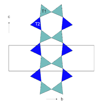 La structure de toutes les amphiboles suit une double chaîne de tétraèdres de SiO4 liés, de composition (Si4O11)n. Les tétraèdres internes sont appelés T1 et les externes sont appelés T2. Le motif de la double chaîne se répète après un bloc de deux tétraèdres T1 et deux tétraèdres T2, avec une distance de répétition d'environ 5,3 Ångström, déterminant la longueur de la cellule unitaire le long de l'axe du cristal c. Les tétraèdres d'une chaîne pointent tous vers l'extérieur dans la même direction, et les chaînes sont reliées dos à dos par des cations pour former des faisceaux en I. Les poutres en I elles-mêmes sont ensuite reliées entre elles et forment la structure complète.