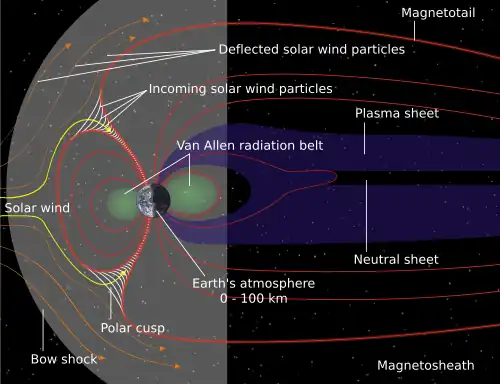 La magnétogaine de la Terre occupe typiquement la région de l’espace située à environ 10 rayons terrestres du côté de la Terre qui fait face au vent solaire (côté faisant face au Soleil) et s’étend considérablement plus loin du côté opposé au vent solaire en raison de la pression du vent solaire. L'emplacement et la largeur exacts de la magnétogaine dépendent de variables telles que l'activité solaire.