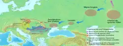 L'arrivée des Huns met fin à la domination des peuples iraniens sur les steppes eurasiennes.[15] Par la suite, les Sabires, les Avars, les Onoghours, les Khazars, ainsi que d'autres peuples turcs maintiennent sous leur contrôle les prairies de l'Europe de l'Est de manière plus ou moins continue pendant plusieurs siècles.[16] Abu Saʿīd Gardēzī, géographe et historien persan actif au cours de la première moitié du XIe siècle, se risque à considérer les Magyars comme étant « une branche des Turcs », une forme de description reprise par Léon VI le Sage et Constantin VII Porphyrogénète, empereurs et auteurs byzantins.[17] Les linguistes ont laborieusement procédé à la reconstitution des quelque 450 termes hongrois empruntés aux langues turques avant l'an 900.[18] Certaines caractéristiques particulièrement ataviques des chansons folkloriques hongroises présentent des similitudes avec celles des Tchouvaches, un groupe ethnique établi principalement en Russie et au Kazakhstan.[19] Sur la base de ces caractéristiques, il est conclu que les Magyars étaient étroitement liés aux Turcs au cours de la longue période qu'ils ont passée dans les steppes pontiques.[20]