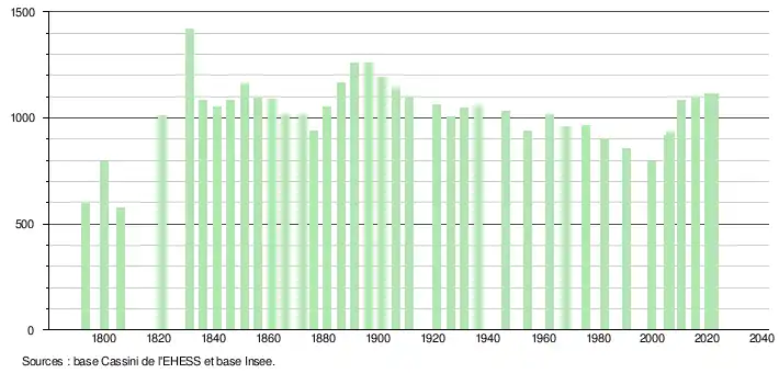 L'évolution du nombre d'habitants est connue à travers les recensements de la population effectués dans la commune depuis 1793. Pour les communes de moins de 10 000 habitants, une enquête de recensement portant sur toute la population est réalisée tous les cinq ans, les populations de référence des années intermédiaires étant quant à elles estimées par interpolation ou extrapolation[21]. Pour la commune, le premier recensement exhaustif entrant dans le cadre du nouveau dispositif a été réalisé en 2005[22].