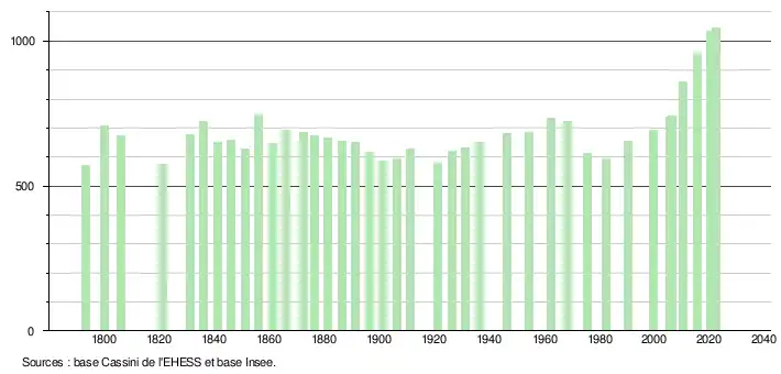 - ↑ Population municipale de référence en vigueur au 1er janvier 2025, millésimée 2022, définie dans les limites territoriales en vigueur au 1er janvier 2024, date de référence statistique : 1er janvier 2022.