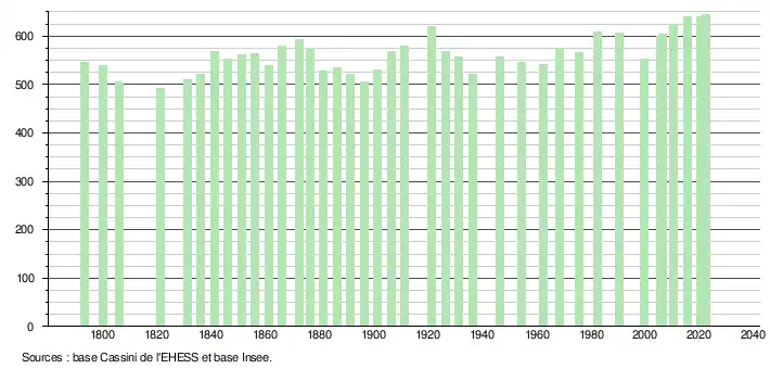 L'évolution du nombre d'habitants est connue à travers les recensements de la population effectués dans la commune depuis 1793. Pour les communes de moins de 10 000 habitants, une enquête de recensement portant sur toute la population est réalisée tous les cinq ans, les populations de référence des années intermédiaires étant quant à elles estimées par interpolation ou extrapolation[29]. Pour la commune, le premier recensement exhaustif entrant dans le cadre du nouveau dispositif a été réalisé en 2005[30].
