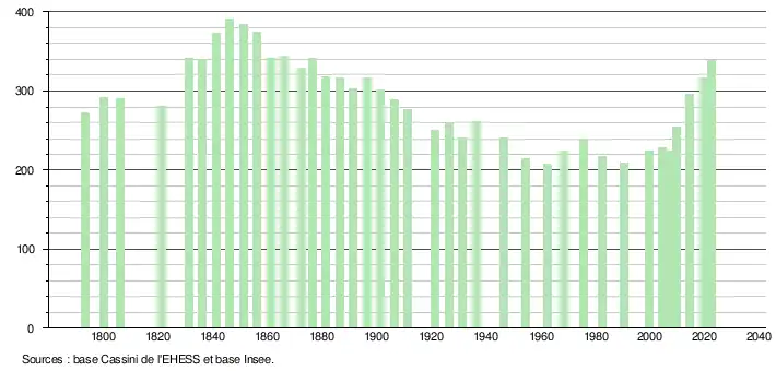 L'évolution du nombre d'habitants est connue à travers les recensements de la population effectués dans la commune depuis 1793. Pour les communes de moins de 10 000 habitants, une enquête de recensement portant sur toute la population est réalisée tous les cinq ans, les populations de référence des années intermédiaires étant quant à elles estimées par interpolation ou extrapolation[13]. Pour la commune, le premier recensement exhaustif entrant dans le cadre du nouveau dispositif a été réalisé en 2004[14].