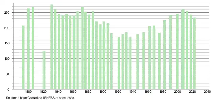 L'évolution du nombre d'habitants est connue à travers les recensements de la population effectués dans la commune depuis 1793. Pour les communes de moins de 10 000 habitants, une enquête de recensement portant sur toute la population est réalisée tous les cinq ans, les populations de référence des années intermédiaires étant quant à elles estimées par interpolation ou extrapolation[12]. Pour la commune, le premier recensement exhaustif entrant dans le cadre du nouveau dispositif a été réalisé en 2007[13].