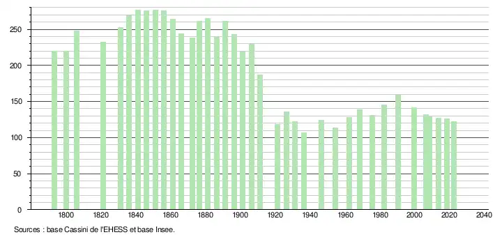 L'évolution du nombre d'habitants est connue à travers les recensements de la population effectués dans la commune depuis 1793. Pour les communes de moins de 10 000 habitants, une enquête de recensement portant sur toute la population est réalisée tous les cinq ans, les populations de référence des années intermédiaires étant quant à elles estimées par interpolation ou extrapolation[24]. Pour la commune, le premier recensement exhaustif entrant dans le cadre du nouveau dispositif a été réalisé en 2008[25].