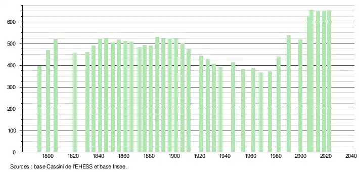 L'évolution du nombre d'habitants est connue à travers les recensements de la population effectués dans la commune depuis 1793. Pour les communes de moins de 10 000 habitants, une enquête de recensement portant sur toute la population est réalisée tous les cinq ans, les populations de référence des années intermédiaires étant quant à elles estimées par interpolation ou extrapolation[23]. Pour la commune, le premier recensement exhaustif entrant dans le cadre du nouveau dispositif a été réalisé en 2008[24].