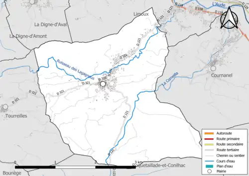 La Corneilla, d'une longueur totale de 21,6 km, prend sa source dans la commune de Festes-et-Saint-André et s'écoule du sud-ouest vers le nord-est. Elle traverse la commune et se jette dans l'Aude à Cournanel, après avoir traversé 6 communes[6].