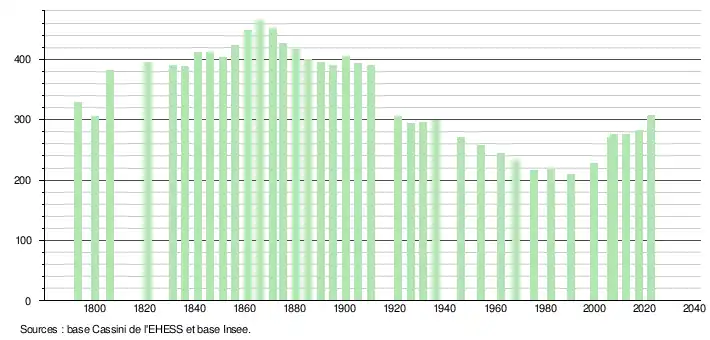 L'évolution du nombre d'habitants est connue à travers les recensements de la population effectués dans la commune depuis 1793. Pour les communes de moins de 10 000 habitants, une enquête de recensement portant sur toute la population est réalisée tous les cinq ans, les populations de référence des années intermédiaires étant quant à elles estimées par interpolation ou extrapolation[16]. Pour la commune, le premier recensement exhaustif entrant dans le cadre du nouveau dispositif a été réalisé en 2007[17].