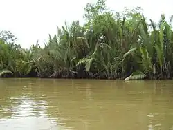 - Zone centrale du delta: principalement couverte par des peuplements de Nypa fruticans, mélangés à d’autres espèces comme Rhizophora et Bruguiera.