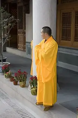 Un moine bouddhiste chinois en robe (kesa) jaune. Les moines bouddhistes chinois portent souvent des robes de la même couleur que celles utilisées autrefois par certaines sectes Mahāsāṃghika en Inde.
