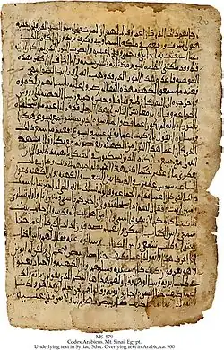 Codex arabicus, palimpseste avec une couche inférieure (datée vers 500) en syriaque encore un peu visible et une couche supérieure (datée vers 900) en arabe, Sainte Catherine du Sinaï.