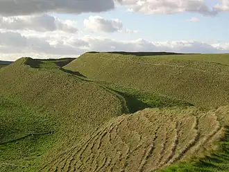 Dans un délai de 50 ans environ, un tumulus en remblai (bank barrow) a été établi sur l'enceinte. C'était un monticule de terre de 546 m de long, avec un fossé de chaque côté, les deux fossés parallèles étant séparés l'un de l'autre de 19,5 m[9]. Beaucoup de tumulus se trouvent disposés au-dessus de tombes et sont des monuments élevés à la mémoire des défunts, mais étant donné que le tumulus de Maiden Castle ne recouvre aucune sépulture, il a été suggéré qu'il devait marquer une limite entre deux zones, ce qui pourrait expliquer l'activité humaine limitée sur la colline durant les 500 ans qui ont suivi la construction du tumulus en remblai[10]. Autour de -1800, au début de l'âge du bronze, la colline a été nettoyée et utilisée pour l'agriculture, mais le sol a été rapidement épuisé et le site abandonné. Cette période d'abandon a duré jusqu'à l'âge du fer, où la forteresse a été construite[11]. Le tumulus en remblai a survécu durant l'âge du fer comme une petite butte et, pendant toute cette période, on a évité de construire au-dessus du tumulus[12].