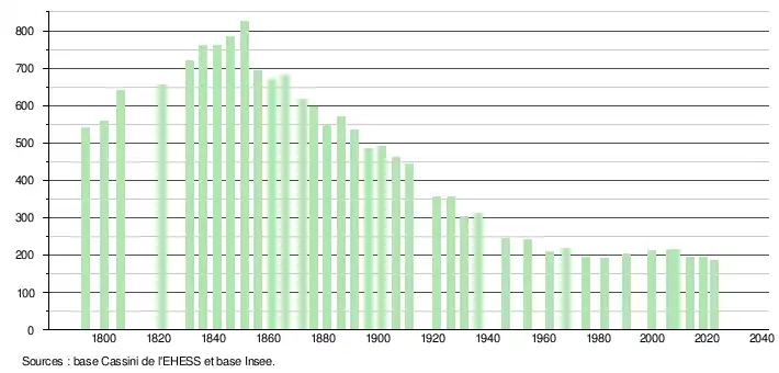 L'évolution du nombre d'habitants est connue à travers les recensements de la population effectués dans la commune depuis 1793. Pour les communes de moins de 10 000 habitants, une enquête de recensement portant sur toute la population est réalisée tous les cinq ans, les populations de référence des années intermédiaires étant quant à elles estimées par interpolation ou extrapolation[19]. Pour la commune, le premier recensement exhaustif entrant dans le cadre du nouveau dispositif a été réalisé en 2008[20].