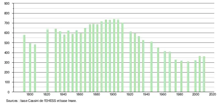 L'évolution du nombre d'habitants est connue à travers les recensements de la population effectués dans la commune depuis 1793. À partir du , les populations légales des communes sont publiées annuellement dans le cadre d'un recensement qui repose désormais sur une collecte d'information annuelle, concernant successivement tous les territoires communaux au cours d'une période de cinq ans. Pour les communes de moins de 10 000 habitants, une enquête de recensement portant sur toute la population est réalisée tous les cinq ans, les populations légales des années intermédiaires étant quant à elles estimées par interpolation ou extrapolation[4]. Pour la commune, le premier recensement exhaustif entrant dans le cadre du nouveau dispositif a été réalisé en 2004[5],[Note 1].