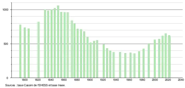 L'évolution du nombre d'habitants est connue à travers les recensements de la population effectués dans la commune depuis 1793. Pour les communes de moins de 10 000 habitants, une enquête de recensement portant sur toute la population est réalisée tous les cinq ans, les populations de référence des années intermédiaires étant quant à elles estimées par interpolation ou extrapolation[21]. Pour la commune, le premier recensement exhaustif entrant dans le cadre du nouveau dispositif a été réalisé en 2006[22].