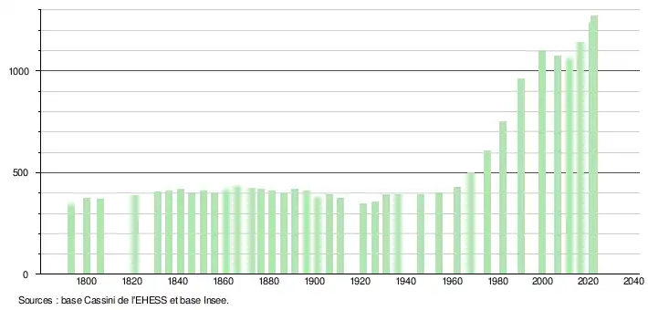 L'évolution du nombre d'habitants est connue à travers les recensements de la population effectués dans la commune depuis 1793. Pour les communes de moins de 10 000 habitants, une enquête de recensement portant sur toute la population est réalisée tous les cinq ans, les populations de référence des années intermédiaires étant quant à elles estimées par interpolation ou extrapolation[19]. Pour la commune, le premier recensement exhaustif entrant dans le cadre du nouveau dispositif a été réalisé en 2006[20].