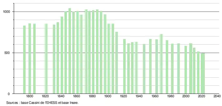 L'évolution du nombre d'habitants est connue à travers les recensements de la population effectués dans la commune depuis 1793. Pour les communes de moins de 10 000 habitants, une enquête de recensement portant sur toute la population est réalisée tous les cinq ans, les populations de référence des années intermédiaires étant quant à elles estimées par interpolation ou extrapolation[14]. Pour la commune, le premier recensement exhaustif entrant dans le cadre du nouveau dispositif a été réalisé en 2005[15].