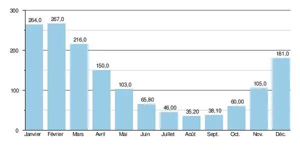 Les crues peuvent être très importantes. La série des QIX n'a pas été calculée, mais la série des QJX l'a bien été. Les QJX 2 et QJX 5 valent respectivement 810 et 1 200 m3/s. Le QJX 10 est de 1 400 m3/s, le QJX 20 de 1 600 m3/s et le QJX 50 se monte à pas moins de 1 900 m3/s.
